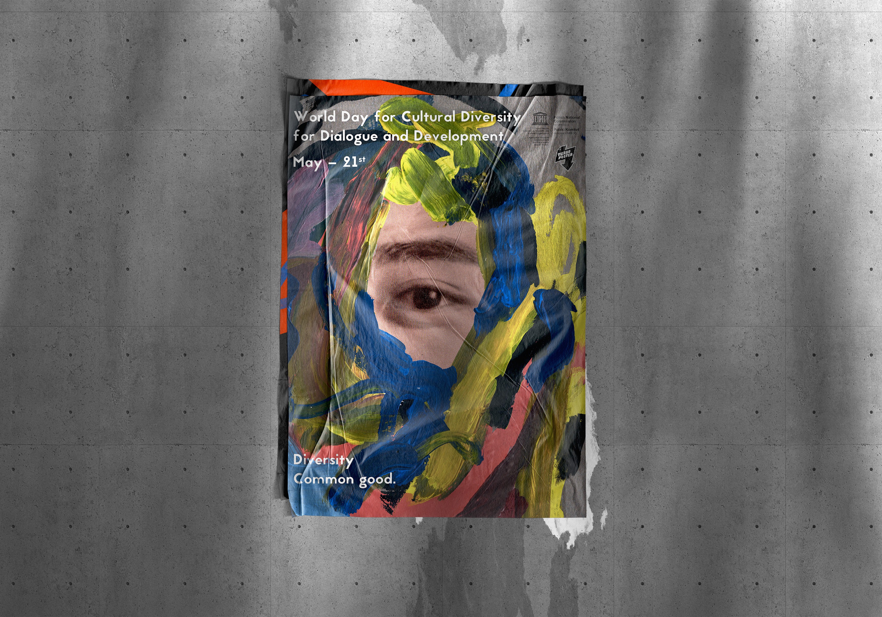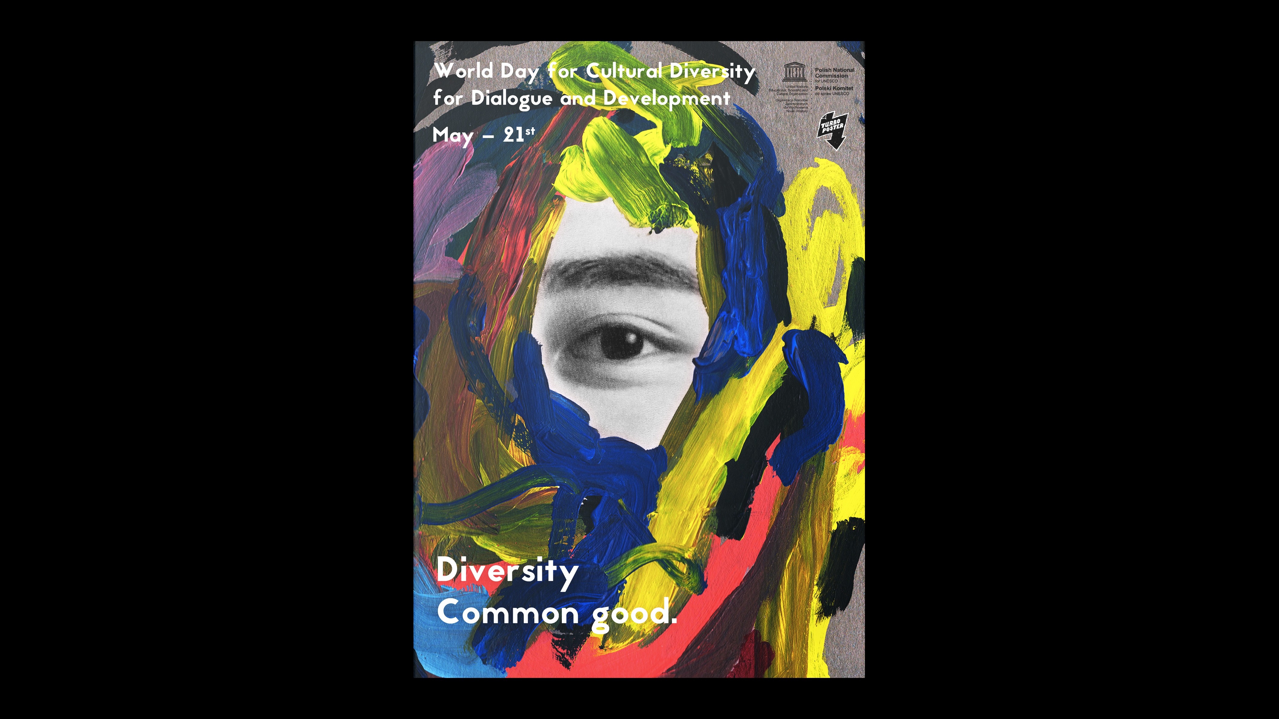 Dans le cadre d’un concours organisé par Turbo Poster en collaboration avec l’UNESCO, j'ai réalisé cette affiche via collage et peinture acrylique en 2 jours. L'idée derrière était de donner un visage représentatif à la diversité culturelle, ainsi formé de multiples couleurs abstraites sans appriori racial ou social, tournées autour de l'œil symbolisant curiosité et ouverture d'esprit, fixant le spectateur comme pour le questionner. Ce projet fut récompensé par une mention du jury.